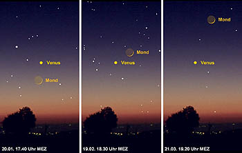 Wenn Venus Abendstern wird und die schmale Mondsichel sich zu ihr gesellt, ergeben sich wunderschöne Fotomotive in der Dämmerung. In den drei Grafiken sind die Begegnungen des Mondes mit Venus von Januar bis März dargestellt. Die erste Begegnung, welche wir beobachten können, findet am 20. Januar statt. Dabei handelt es sich um eine interessante Konstellation.