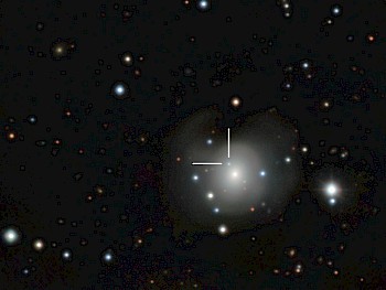 Galaxie NGC 4993 im Sternbild Hydra, aufgenommen mit dem Instrument "GROND" am 2,2-m-Teleskop auf La-Silla; markiert ist die Position der sog. Kilonova, die bei der Verschmelzung zweier Neutronensterne aufleuchtete [ESO / S. Smartt & T.-W. Chen]