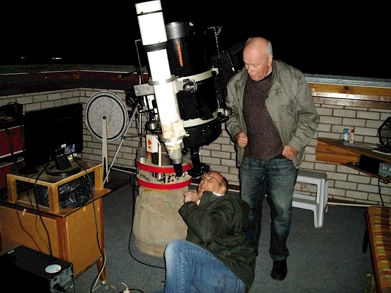 Am darauffolgenden Tag wurde unsere mitgebrachte Fotoausrüstung montiert. Hierzu gehörten u.a. eine Vixen GP Montierung, diverse Objektive (Festbrennweiten von 16 bis 600 mm) sowie Kameras (analog und digital). Hierbei hat sich ein Spiegelobjektiv mit 600mm Brennweite als idealer Allrounder erwiesen - zum einen als Objektiv zur Fotografie (Mondfinsternis) und zum anderen als Guidingscope zur Nachführung der parallelmontierten Kameras (bis zu 4 Stück) auf der Vixen GP Montierung. Alles konnte ohne zusätzliche Übergepäckkosten transportiert werden. Nachgeführt wurde dabei klassisch mit beleuchtetem Fadenkreuzokular.