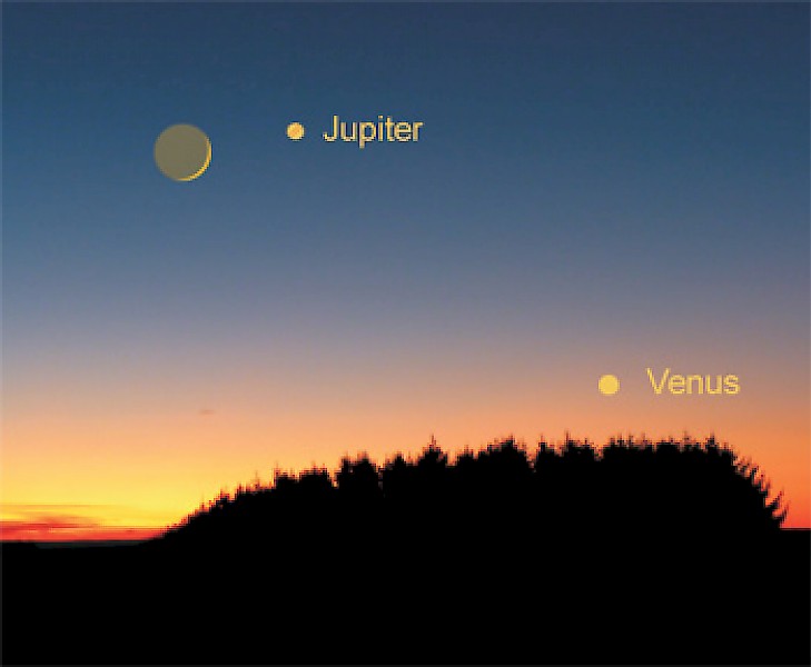 Die schmale, zunehmende Mondsichel trifft am Abend des 12. Mai tief über dem Westhorizont auf Jupiter. Knapp über dem Horizont ist Venus zu erkennen.