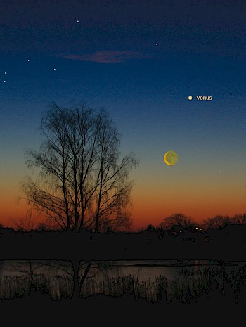 03h 20min: Letzte Sichtbarkeit der abnehmenden Mondsichel bei Venus (7.0°)