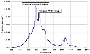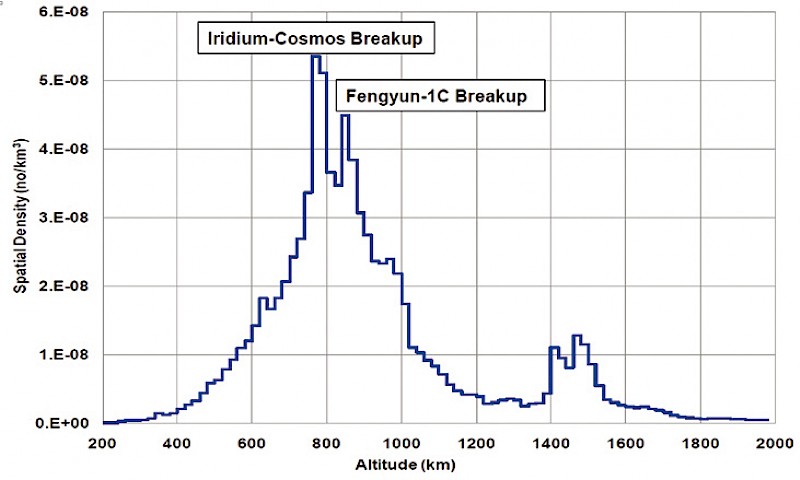 Die größeren Partikel (>10 cm) sind relativ gut bekannt. Etwa 18.000 sind erfasst und werden kontinuierlich beobachtet. Eventuell kennt man noch ein paar weitere Tausend Objekte, die aus militärischen Gründen geheim gehalten werden. In den 1970er und 80er Jahren führten nämlich die USA und die Sowjetunion mancherlei Waffentests durch. Nachdem beide das Problem des Weltraummülls erkannt hatten, arbeiteten sie auf dem Gebiet der Vermeidung zusammen. Entsprechend groß war dann die Aufregung, als China 2007 eine eigene Anti-Satelliten-Waffe ausprobierte. Die Chinesen zerstörten gezielt einen eigenen Satelliten (Fengyun-1C), und dessen Trümmer wurden auf viele verschiedene Bahnen bis in große Höhen geschleudert (Abb. 2).
