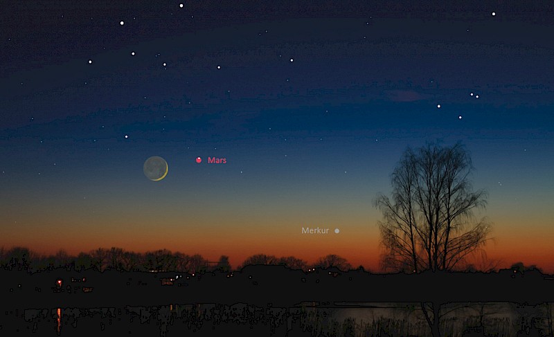 21h 30min: Mond bei Mars (3.4°), Merkur in der Nähe, siehe Grafik