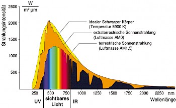 Abb. 1: Das Sonnenspektrum (orange) hat sein Maximum bei 500 nm, aber es wird ebenfalls auf die durch die Atmosphäre (schwarz) reduziert.