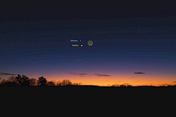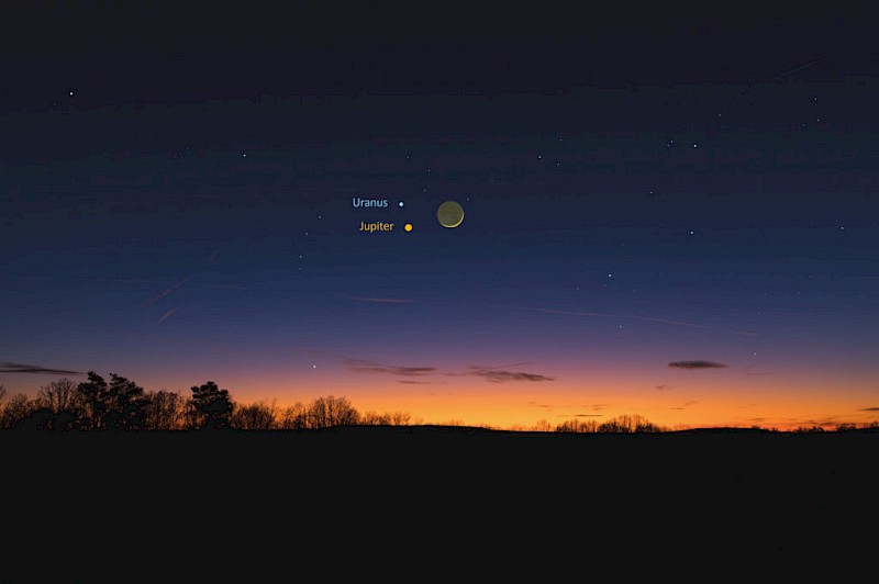 Abb. 1: Die schmale Mondsichel zusammen mit Jupiter und Uranus am Abend des 10.4.2024. (Grafik: Heiko Ulbricht)