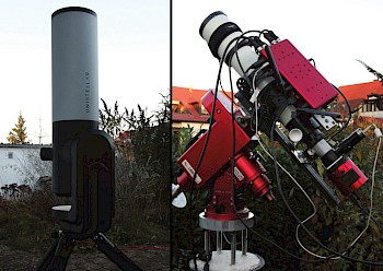 Um die Leistungsfähigkeit des Teleskops einschätzen und bewerten zu können, habe ich im Praxistest aus meiner eigenen Teleskopsammlung einen apochromatischen 3“ Refraktor mit 560mm Brennweite bei f/7 herausgesucht und auf einer äquatorialen Montierung eingerichtet. Die beiden Geräte (Abb. 1) sollten nun gegeneinander antreten und ihre jeweiligen Qualitäten im Live-Modus zeigen.