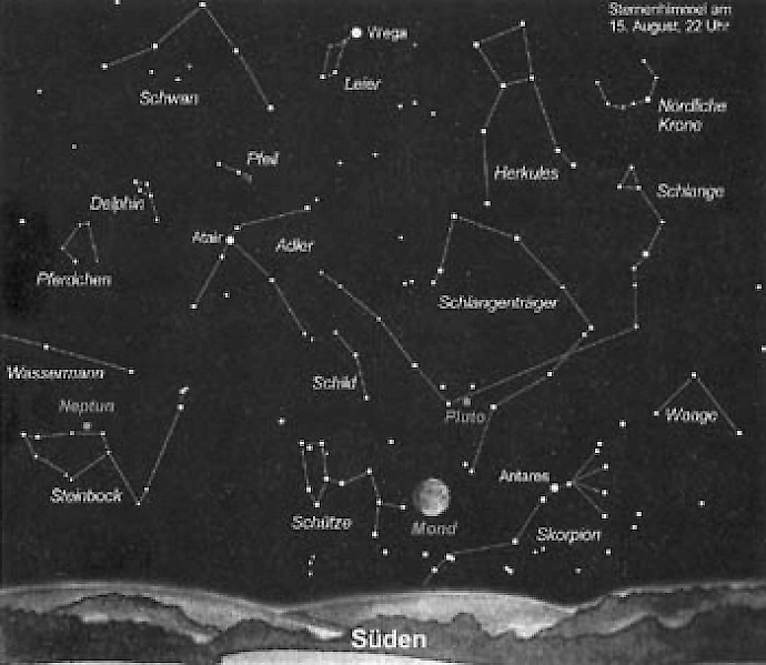 Zur Quartalsmitte stehen die typischen Figuren des Sommers um 22 Uhr in großer Höhe über dem Südhorizont. Es handelt sich um die markantesten Sternbilder Leier mit Wega, Schwan mit Deneb und Adler mit Atair. Diese drei Hauptsterne bilden das bekannte Sommerdreieck, was zwar kein eigenständiges Sternbild darstellt, sich aber sehr gut einprägen lässt und zur Orientierung am sommerlichen Sternenhimmel bestens geeignet ist. Schwan, Leier und Adler liegen inmitten der Milchstraße, welche sich zu dieser Jahreszeit steil über den Südosthorizont erhebt. Außerhalb unserer hell erleuchteten Ortschaften ist ein Spaziergang entlang der Milchstraße mit einem Feldstecher ein besonders eindrucksvolles Erlebnis. In der Gegend um die Sternbilder Schwan und Adler zeigt die Milchstraße eine besonders zerklüftete Struktur. Die stellenweise vorhandene "Sternenleere" wird durch vorgelagerte Dunkelwolken hervorgerufen, welche das Licht dahinterstehender Sterne absorbiert. Etwas nördlich von Deneb fällt eine dunkle Höhle auf, die als "nördlicher Kohlensack" bezeichnet wird. Hier lagert in einer Entfernung von ca. 1800 Lichtjahren eine Dunkelwolke, welche den Eindruck einer solchen Sternenleere hervorruft.