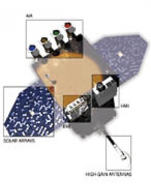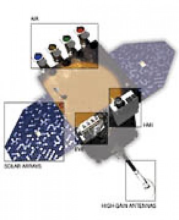 Abbildung 2: Die drei wissenschaftlichen Instrumente sowie Solarzellen und Antenne von SDO