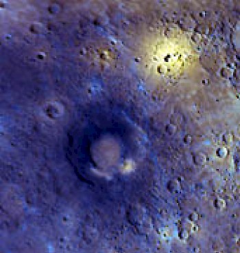 Abbildung 2: Krater Rachmaninoff in Falschfarbendarstellung, fotografiert am 29.9.2009 beim dritten Vorbeiflug von Messenger an Merkur. Der Doppelringkrater hat einen Durchmesser von 290 km. Diese Region zeichnet sich sehr wahrscheinlich durch eine hohe vulkanische Aktivität in vergangenen Zeiten aus. Die blaue Färbung kennzeichnet Material aus tieferen Schichten, während eine gelbe Färbung auf oberflächennahes Material hinweist. Der Kraterboden ebenso wie große Teile der Umgebung sind sehr glatte Flächen, welches ein Indiz für eine frühere vukanische Aktivität darstellt (flüssige Magma verteilte sich gleichmäßig).
