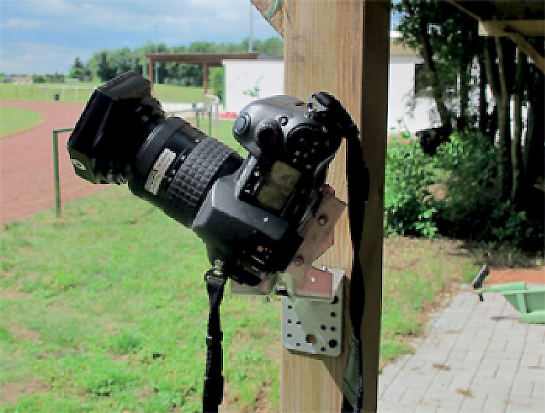 Auf unserem Sportplatz fand ich einen geeigneten Ort, an dem ich meine Kamera positionieren konnte, um mindestens einmal wöchentlich vom gleichen Standpunkt und zur gleichen Uhrzeit ein Foto von der Sonne zu machen. Ich besorgte mir zwei Winkel aus dem Baumarkt und schraubte einen als Basis an einen Pfosten (Abb. 1). Der zweite Winkel diente als Gegenstück und bildete mit meiner Olympus-Kamera für ein ganzes Jahr eine Einheit. Somit war sichergestellt, dass bei der wöchentlichen Montage die Position der Kamera reproduziert werden konnte. Die Neigung der Kamera-Halterung zeigte auf die mittlere Höhe des zu erwartenden Analemmas und stellte sicher, dass die Sonne weder bei der Sommer- noch bei der Wintersonnenwende außerhalb des Bildfeldes liegt. Die Höhen der Sonne über dem Horizont liegen in unseren Breiten zu diesen Zeitpunkten bei 61,5 Grad bzw. 24,5 Grad.