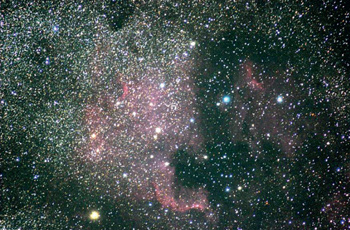 Der Schwan bietet uns einige schöne Objekte, die - mit einem lichtstarken Fernglas betrachtet - zu den schönsten sommerlichen Objekten zählen. Zuerst wäre da der Nordamerikanebel (Abb. 1) zu nennen, der die NGC-Nummer 7000 trägt. Wir haben es hier mit einer dem Orionnebel vergleichbaren Ansammlung interstellarer Materie zu tun. Jedoch ist die Flächenhelligkeit des Nordamerikanebels deutlich geringer als die des Orionnebels. Die zu beobachtende Sternarmut am westlichen Rand des Nebels wird durch vorgelagerte Dunkelwolken erzeugt. Zwei weitere Dunkelwolken können ebenfalls am Sommerhimmel beobachtet werden. Erstere liegt etwa 6° nördlich von NGC 7000 und ist sehr deutlich in der sonst sternreichen Gegend zu erkennen. Sie trägt den Namen "Nördlicher Kohlensack" und befindet sich etwa 1800 Lichtjahre von uns entfernt. Eine weitere Dunkelwolke, die als "Dreiteilige Dunkle Höhle" bezeichnet wird, befindet sich 1.5 Grad westlich des Sterns γ Aql. Im Gegensatz zu den beschriebenen Objekten finden wir unterhalb des Adlers eine besonders helle Milchstraßenregion, die Schildwolke. Mit dem Fernglas erkennen wir hier besonders eindrucksvolle offene und kugelförmige Sternhaufen, deren Betrachtung zu den schönsten Beobachtungen am sommerlichen Sternenhimmel zählt.
