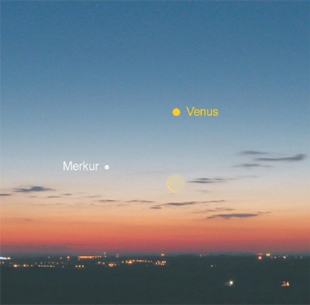 Abb. 1: Der Mond trifft am Morgen des 25. Juli auf die beiden inneren Planeten des Sonnensystems, Merkur und Venus.