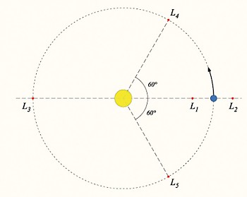 In der vorherigen Ausgabe der Sternzeit haben wir den gravitativen Einfang von Asteroiden durch die Erde thematisiert. Im Sonne-Erde-System kennt man einen sogenannten „trojanischen Asteroiden“ (2010 TK7), der mit der Erdbahn koorbital die Sonne umrundet. Im zweiten Teil dieses Artikels wenden wir uns den Lagrange-Punkten des Erde-Mond-Systems zu. Ist es möglich, dass sich in den beiden Stabilitätspunkten der Mondbahn, L4 und L5, irgendwelche Himmelskörper aufhalten können?