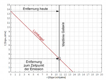 Auf der horizontalen Achse ist die Entfernung in Giga-Lichtjahren, auf der vertikalen Achse die Zeit in Giga-Jahren aufgetragen, beginnend beim Urknall vor 13,7 Giga-Jahren. Beispielhaft ist die Weltlinie einer Galaxie eingezeichnet, die wir heute in einer (Emissions-) Entfernung von 10,7 Giga-Lichtjahren und zum (Emissions-) Zeitpunkt von 3 Giga-Jahren sehen. Da es sich bei dem betrachteten Beispiel um ein stationäres Universum handelt, bleibt die Entfernung der Galaxie konstant.