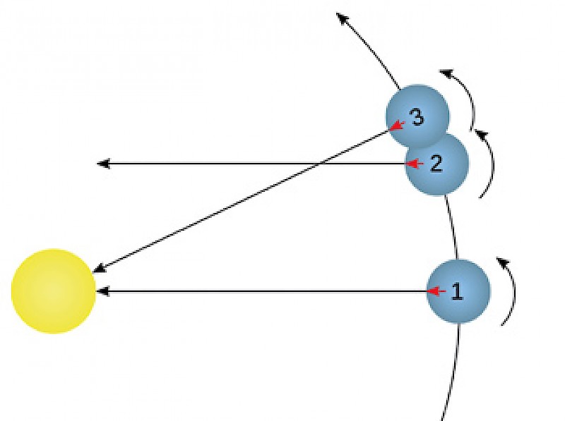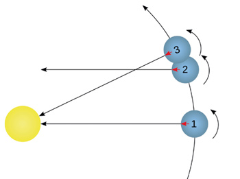 Abb. 1: Die Erde auf ihrer Umlaufbahn um die Sonne. Zwischen zwei wahren Mittagen (1-3) muss sie sich etwas mehr als nur einmal um ihre Achse (1-2) drehen.
