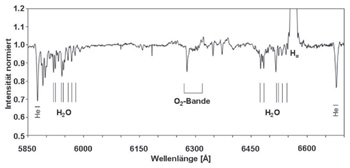 Das beispielhaft abgebildete Spektrum von ζ Tau (Abb.1) wurde bei niedrigem Stand über dem Horizont und hohem Wasserdampfgehalt der Luft aufgenommen, so dass die Wasserlinien trotz relativ geringer Auflösung des Spektrums stark ausgeprägt sind. In diesem Beitrag möchte ich anhand einiger Beispiele auf mögliche Einflüsse dieser Wasserlinien auf die Auswertung und Interpretation von Sternspektren aufmerksam machen. Insbesondere bei Be-Sternen mit sehr stark verbreiterter Hα- Emission sind diese nicht zu unterschätzen und werden meines Erachtens in der Amateurspektroskopie noch nicht angemessen berücksichtigt.