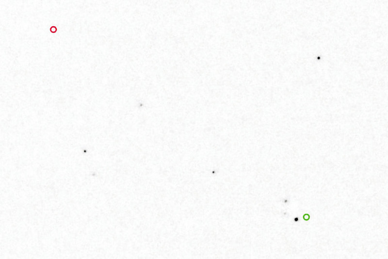 Abb.1: Foto des südlichen Berei- ches des Sternbilds Löwe, mit Stern Wolf 359 rechts unten (hellster Stern im Bild), invertierte Darstellung: Sterne sind dunkel, Himmel ist hell. Aufnahme am Abend des 22.04.2020 von Kelmis aus (Sternwarten-Code K85). Oben ist Norden, links ist Osten, der Bildausschnitt ist 600“ x 400“ groß. Eingezeichnet ist auch in Grün die Position des Sterns auf dem von New Horizons fast gleichzeitig aufgenommenen Bild, etwa 15“ rechts davon. Ferner sieht man links oben, in Rot, die von Max Wolf 1918 gemessene Position des Sterns Wolf 359.
