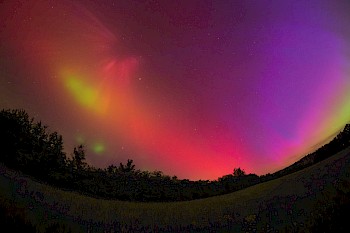 Magische Auroranacht vom 10. auf den 11.05.2024. Nach Mitternacht, am 11.05., begann eine sehr hohe Aktivitätsphase. Mehrere Arten von Aurorae waren sichtbar: roter SAR-Bogen, eine Corona im Sternbild Bootes, grüne RAGDA-Flecken über dem Südhorizont(!), rechts das grüne Oval und Beamer aus angeregtem Stickstoff. (Foto: Heiko Ulbricht)