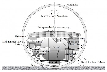 Die Trägerstruktur für Instrumente und Antrieb muss den Drucktank tragen, sollte also entsprechend stabil sein. Ich rechne daher mit Stahl. Die Antriebsräder und Stützkugeln werden zur Schonung der Hülle beim Abrollen mit Hochtemperaturkunststoff (z.B. Polyphenylen, T = 500 °C) beschichtet.
