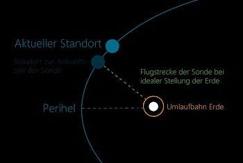 Die sonnennächste Stelle in der Umlaufbahn wird Sedna erst in 60 Jahren erreichen - wir wollen trotzdem nicht so lange mit dem Start warten. Indem man die Sonde bereits jetzt auf die Reise schicken würde, wird sie zwar länger brauchen, als würde sie zur sonnennächsten Stelle fliegen, erreicht ihr Ziel aber um Jahrzehnte früher. Kennt man nun die präzise Stellung Sednas zur Erde, kann man berechnen, in welcher Stellung die Erde sein muss, um die Sonde loszuschicken und nach der Zeit, die die Sonde dann dementsprechend braucht, Sedna auf seiner Umlaufbahn treffen. Eine modellhafte Darstellung unserer Gedanken ist in Abb. 4 dargestellt.